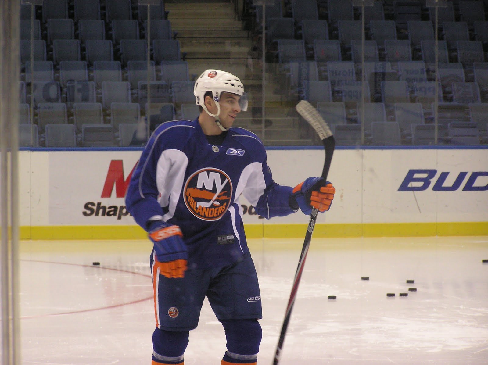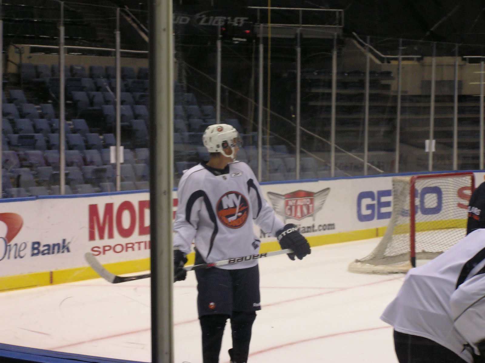 The name plate on the back of his jersey spans from shoulder to shoulder and then some. But there were also a few others with the same situation. DiBenedetto, Rakhshani and Klementyev, names with many consonants stretched across colorful jerseys. Some we will see again, others we will only see at these camps. Scott Gordon and Scott Allen were their usual reserved selves on the ice while Sound Tigers coach Jack Capuano was his usual, smiling and gum chewing self. The scruffiest man on the ice has to be Robin Figren who could body double for the Geico cave man. Just kidding… sort of. Charles Wang stopped by for a few hours to check out the future of his team. He watched from the stands in the company of GM Garth Snow and then went down to the ice to say hello to John Tavares and Calvin deHaan (I hope that was deHaan). Anders Nilsson and Mikko Koskinen are a matched pair of 6’5” goalies, according to the stat sheets. But for some reason, Mikko still looks bigger. It made me giggle overhearing one of the reporters say “What’s his style? Standing.”