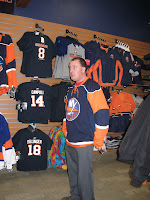 Now, while I was there this guy to the right "Frank" came in with his friend. It seems that "Frank" needed to try on a particular size jersey to see what size he needed to order for himself. The problem was that Frank here is actually a Ranger fan, which he immediately announced upon entering the store. His saving grace was that he was with his friend, who was an Islanders fan. Of course WE just HAD to snap a photo of Frank sporting an Islanders jersey.